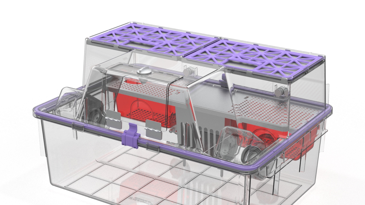 NexGen Rat Housing that complies with CCAC (Canadian Council on Animal Care) requirements and other global standards for rat housing, permitting optimal bipedal posture and animal enrichment.